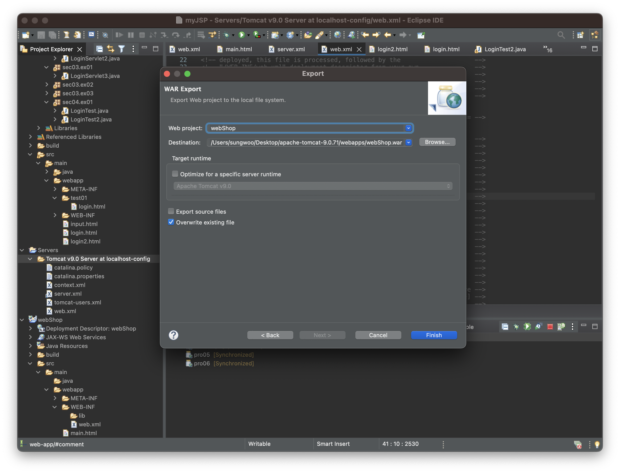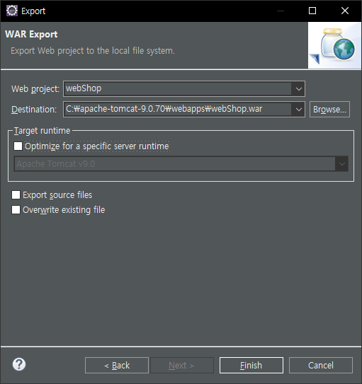 여기서는 Destination으로 톰캣 위치의 webapps 내에 webShop.war로 설정하였다.