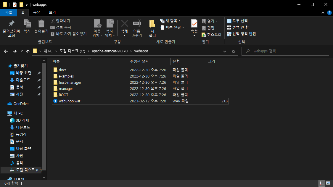7. webapps 폴더에 보면 webShop 폴더가 압축이 자동으로 풀려 배포가 완료된 상황이다.