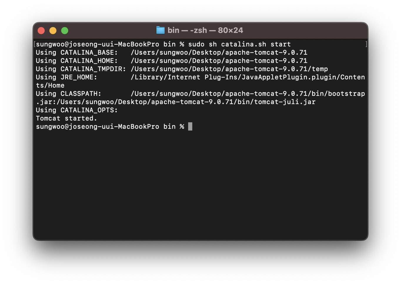 6. sudo sh catalina.sh start 입력하여 톰캣 실행시켜주기.