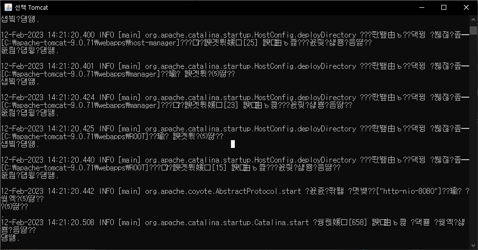 6. 그럼 이렇게 로그가 뜨는데 한글이 깨진다.... 어쨌든 마지막 줄에 [org.apache.catalina.startup.Catalina.start] 라는 글자가 적혀있다면 톰캣이 실행된 것이고,