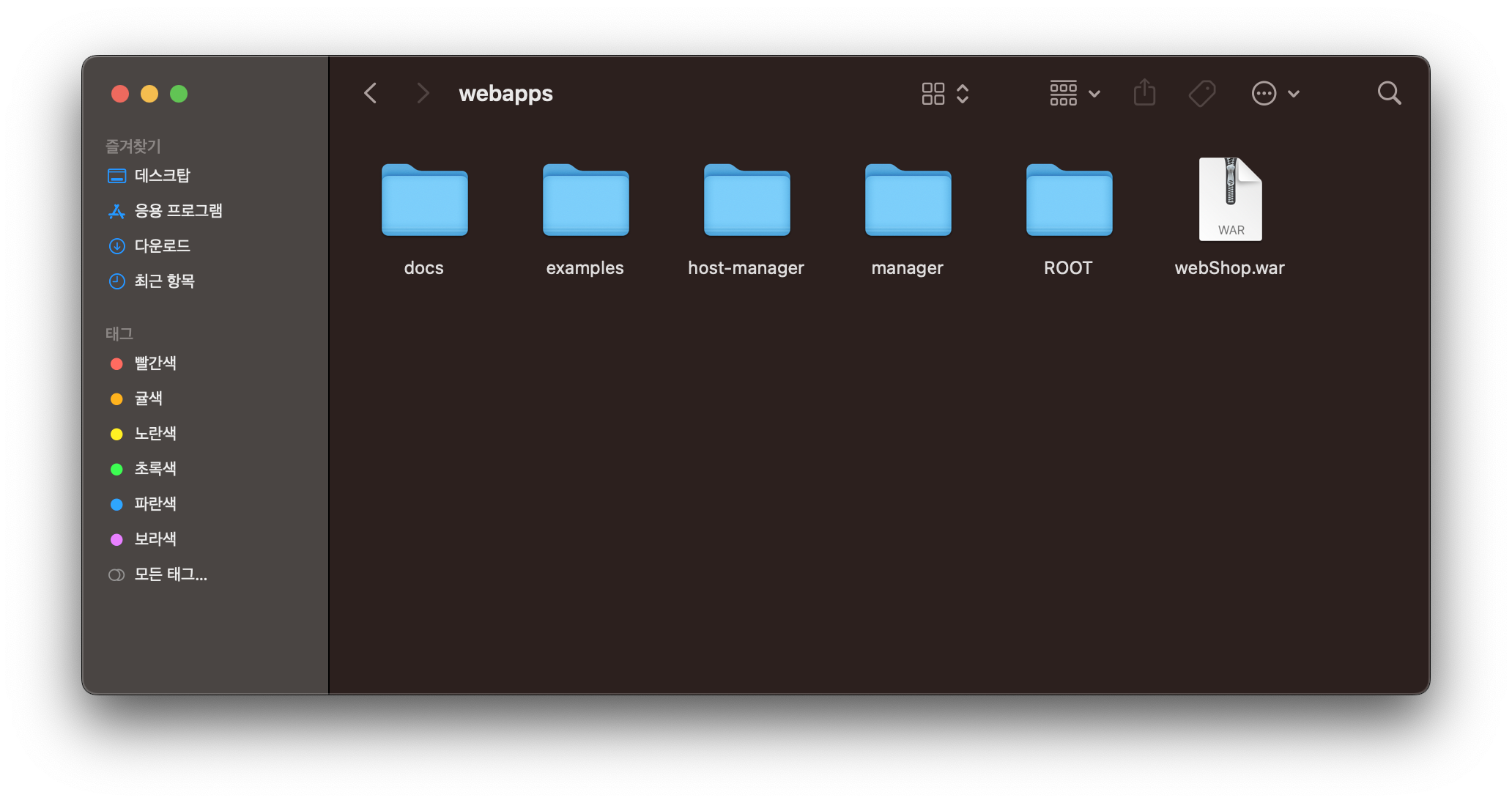 이렇게 톰캣의 webapps 폴더에 위치하는 웹 애플리케이션은 직접 server.xml에 등록하지 않아도 톰캣 실행 시 자동으로 등록된다. 따라서 webShop.war를 미리 webapps 폴더에 위치시킨 후 톰캣을 실행하면 톰캣이 알아서 압축을 해제하고 생성된 웹 애플리케이션을 자동으로 등록해준다.