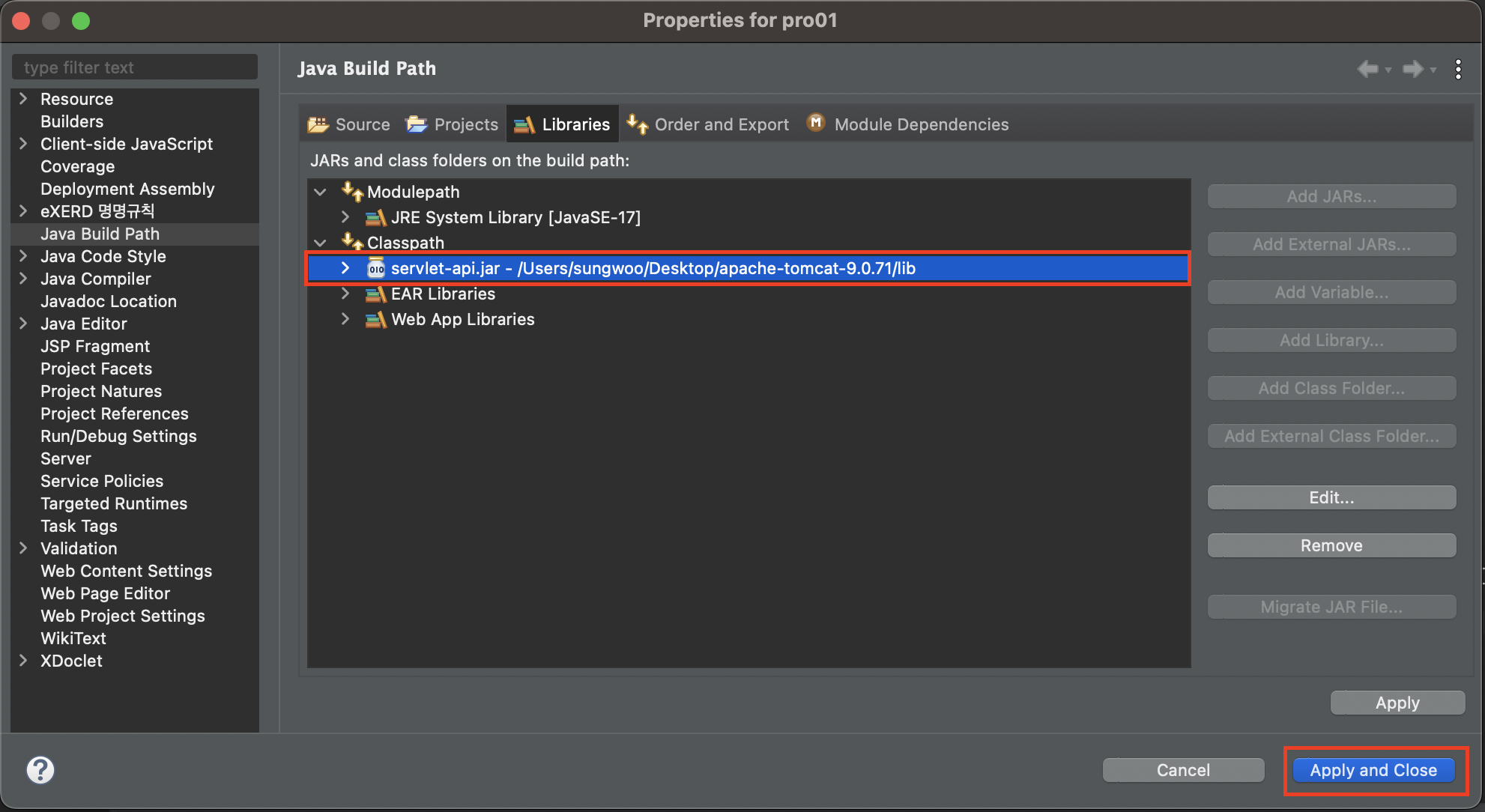 추가된 servlet-api.jar 클래스의 패스 설정 확인 후 Apply and Close 클릭하여 종료
