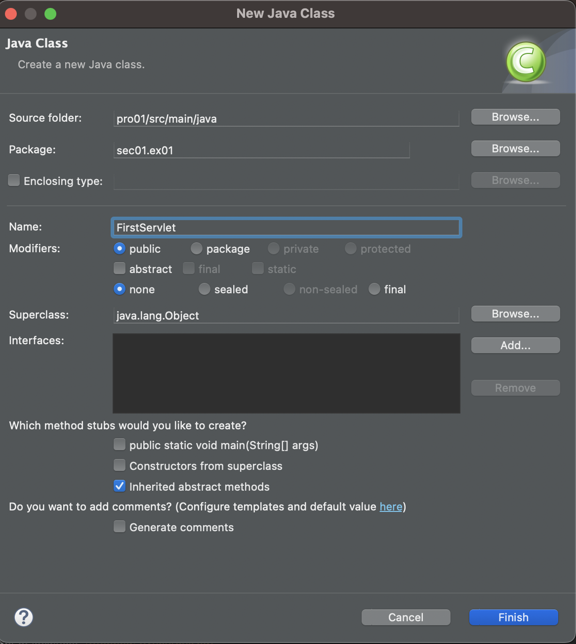 실제로 브라우저의 요청을 처리하는 첫 번째 서블릿 생성하기