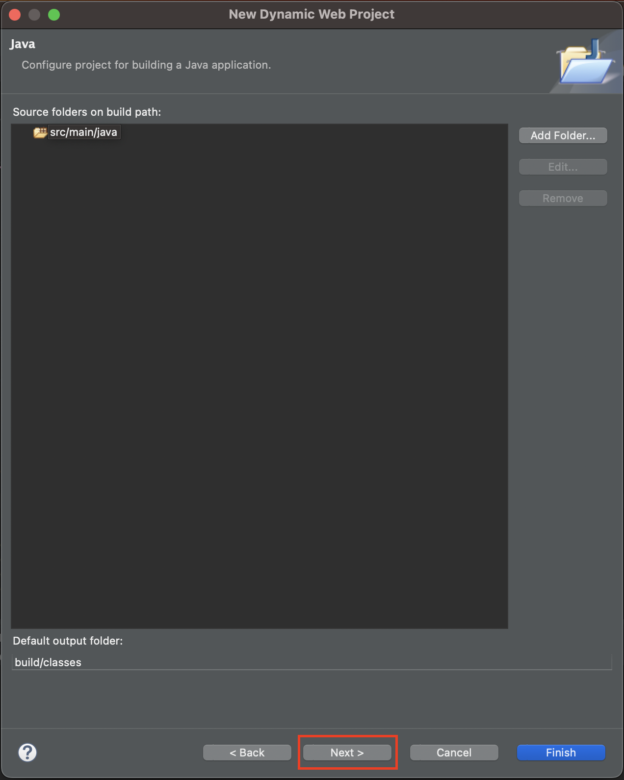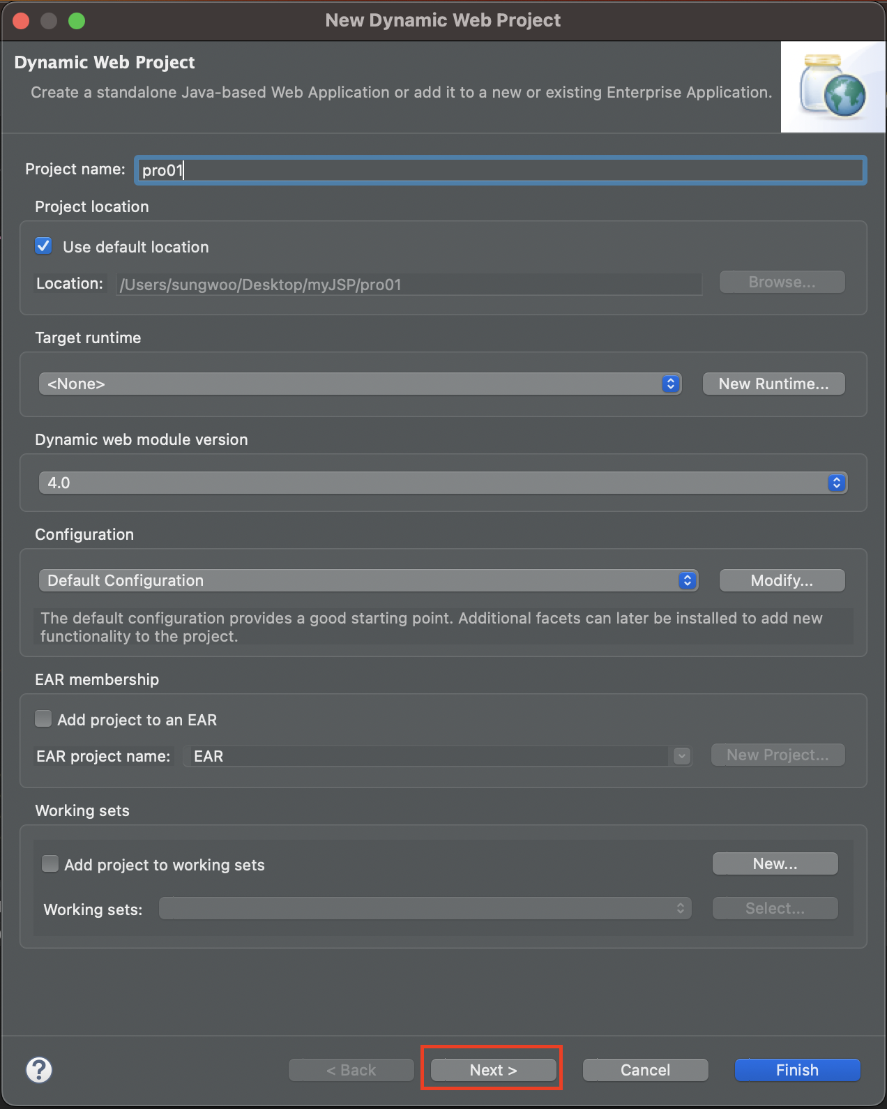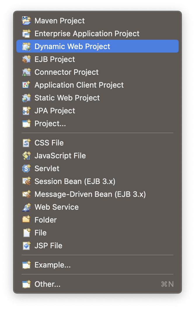 이클립스 상단 메뉴의 File -> New -> Dynamic Web Project를 클릭하여 새 프로젝트를 생성한다.