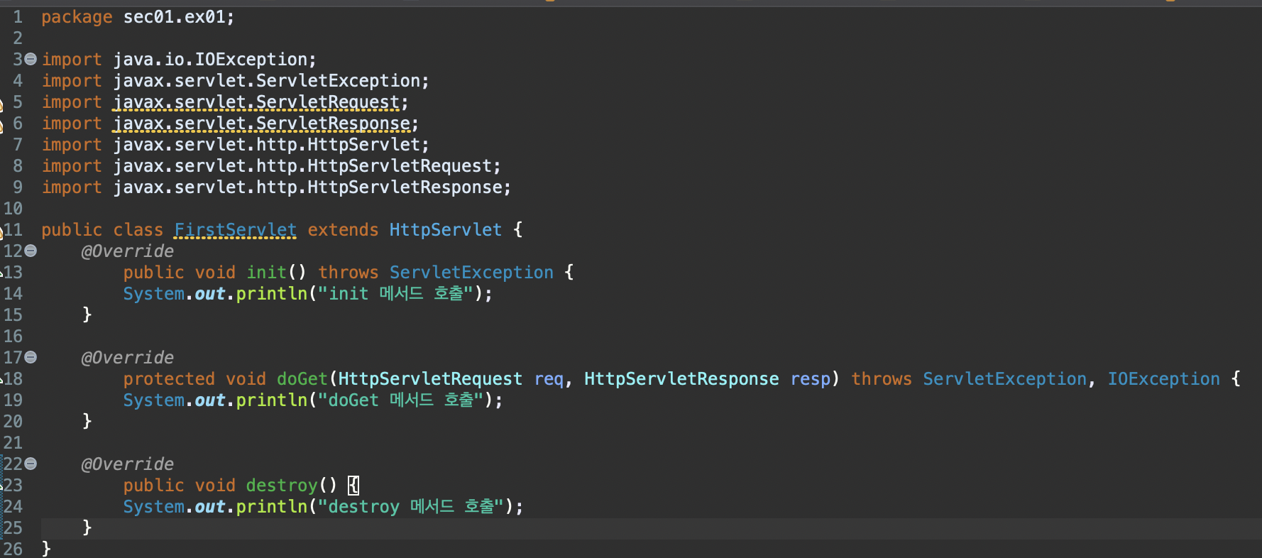 먼저 사용자 서블릿을 만들기 위해서는 아래 예시 코드와 같이 HttpServlet 클래스를 상속받아야 하고 3개의 생명주기 메서드, 즉 init(), doGet, destroy() 메서드를 오버라이딩하여 기능을 구현한다.