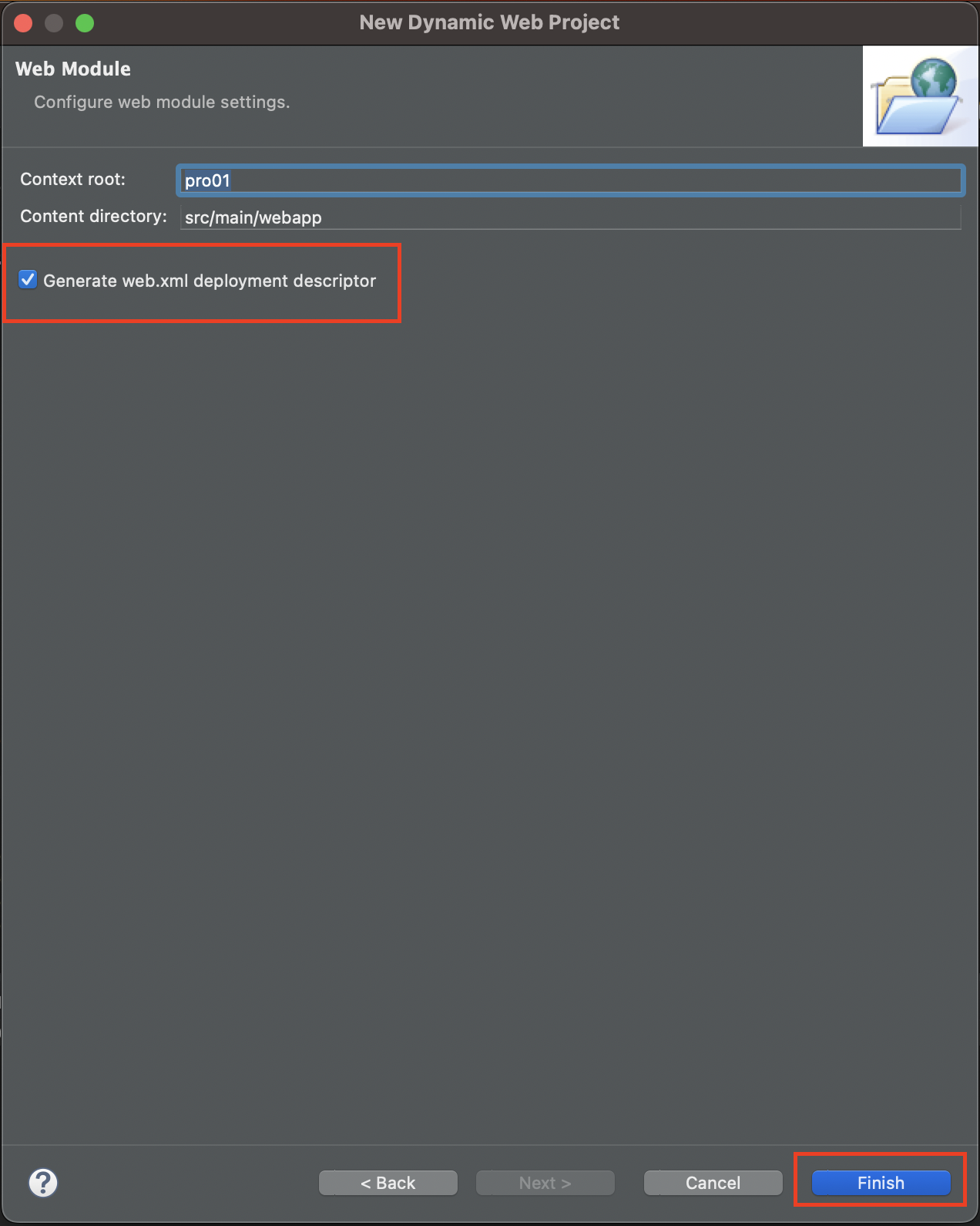 "Generate web.xml deployment descriptor" 에 체크해주고 Finish 클릭