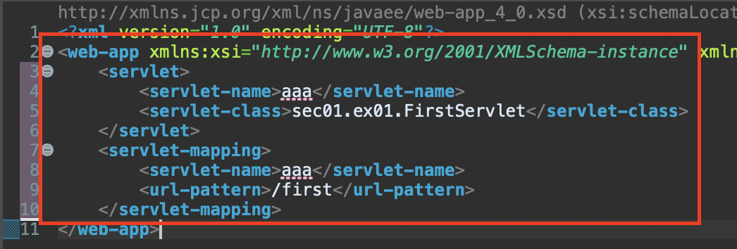 <servlet-name> 태그의 값 aaa가 <servlet>과 <servlet-mapping> 태그를 연결시켜 주는 역할을 하고, 웹 브라우저에서 <url-pattern> 태그의 /first로 요청할 경우 aaa 값을 가지는 <servlet> 태그를 찾아 실제 서블릿인 sec01.ex01.FirstServlet을 실행하는 것이다.