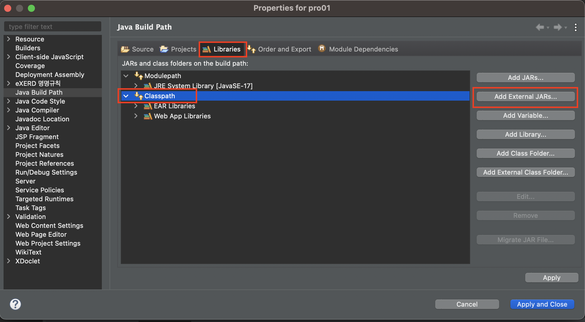 Libraries탭에서 Classpath 클릭 -> Add External JARs... 를 클릭