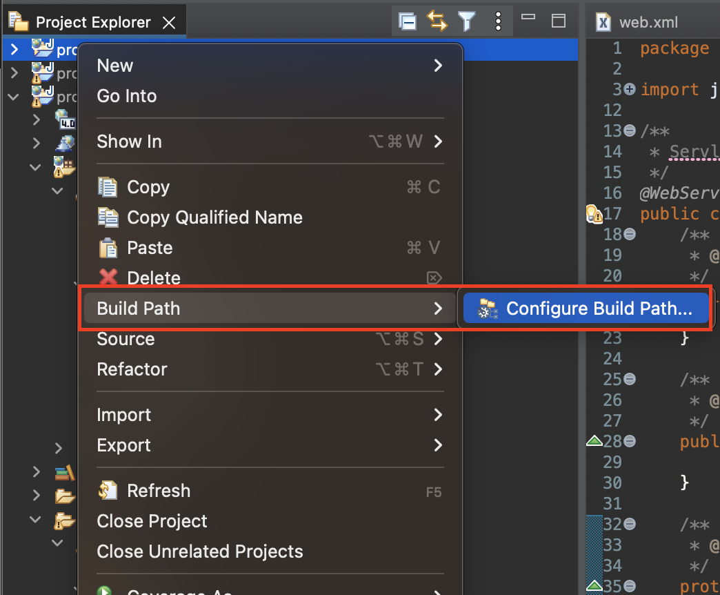 Project Explorer에서 방금 생성한 프로젝트를 우클릭하여 Build Path -> "Configure Build Path..." 클릭