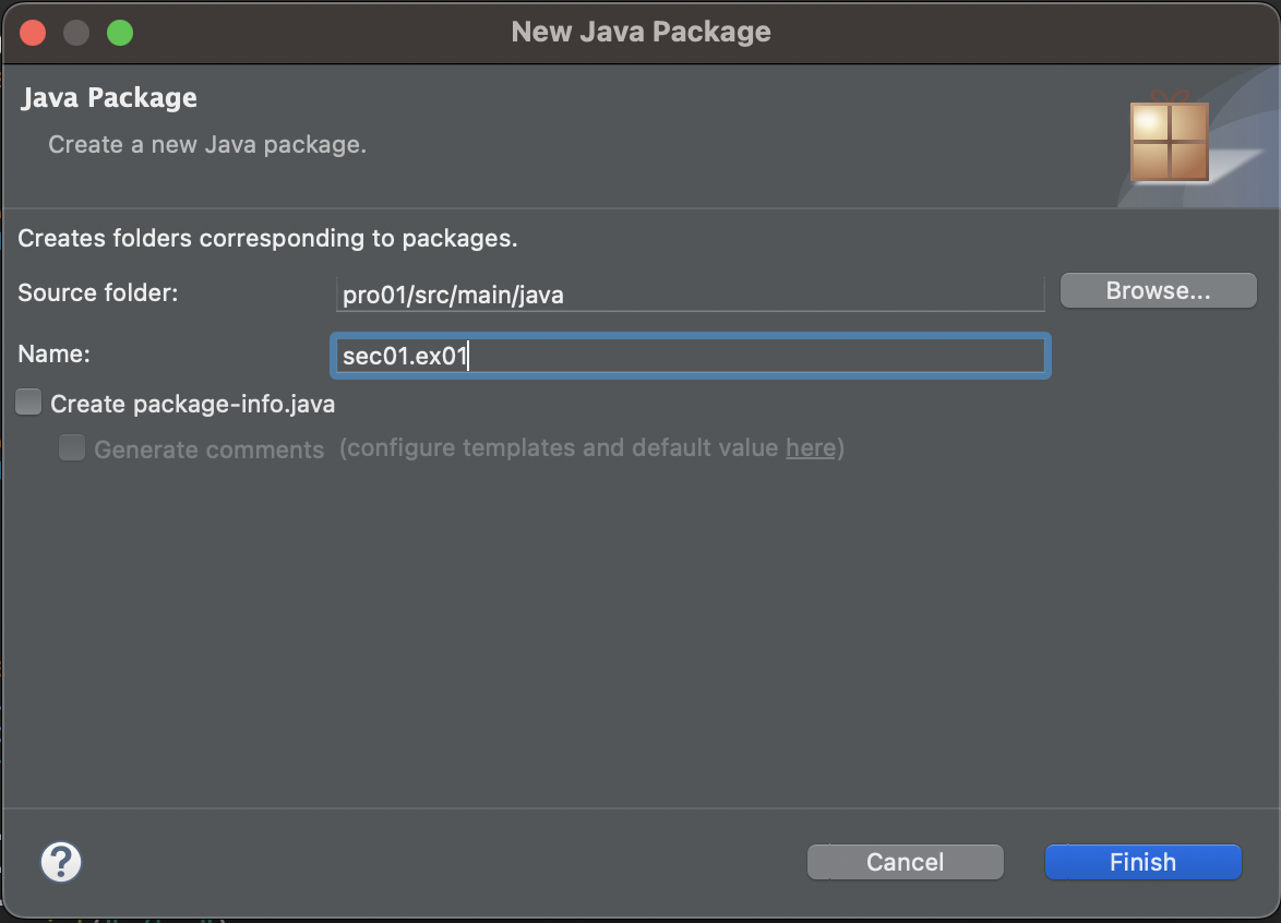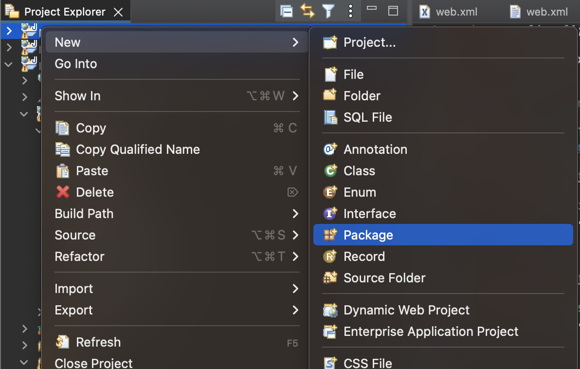 방금 생성한 패키지에서 New -> Class 를 클릭