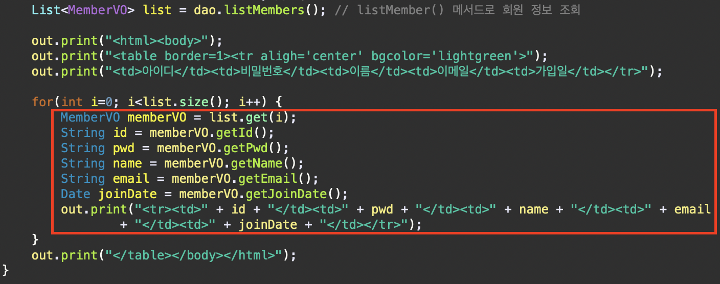 - ArrayList를 다시 메서드를 호출한 MemberServlet으로 반환하고 ArrayList의 MemberVO를 차례대로 가져와 회원 정보를 HTML 태그의 문자열로 만듬