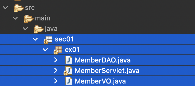 6. sec01.ex01 패키지를 만들고 MemberDAO, MemberServlet, MemberVO 클래스를 각각 작성