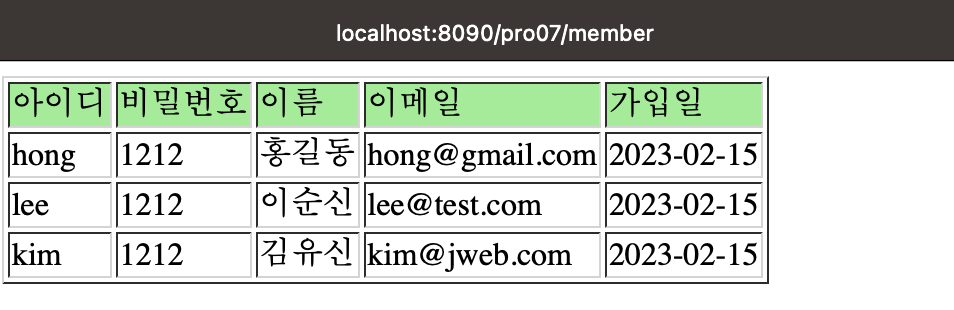 http://localhost:8090/pro07/member로 요청하면 결과를 확인할 수 있다.