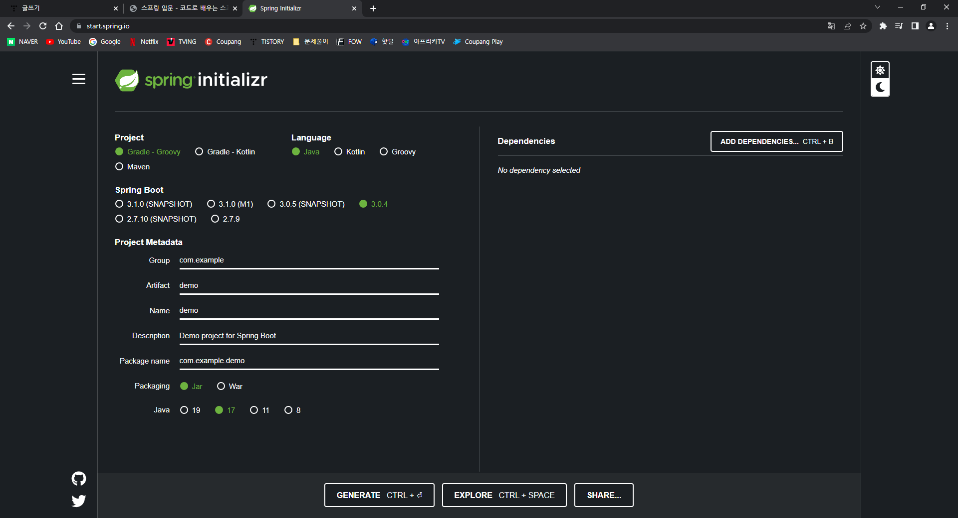 선택한 스프링 버전, 언어 등이 플러그인으로 들어감