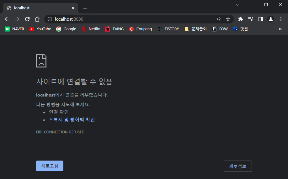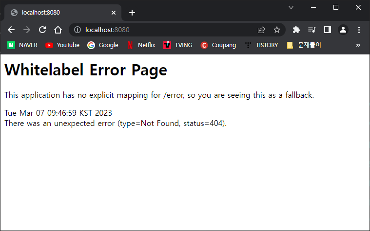 검색창에 localhost:8080 입력하면 다음과 같이 에러페이지가 뜨는 것이 정상