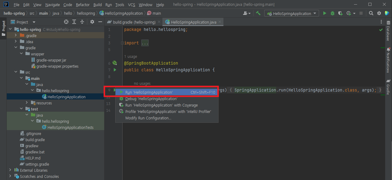 main 메서드 실행 버튼(Run 'HelloSpringApplication') 클릭