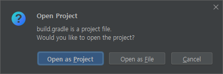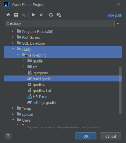 인텔리제이 실행 후 Open 클릭 후 C:\study\hello-spring\build.gradle 선택 후 OK 클릭