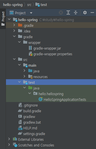 3. src의 main과 test 폴더: 요즘은 main과 test가 나눠져있는게 표준화 됨. main 밑에는 java(실제 패키지 및 소스파일), resources(자바 코드 파일을 제외한 파일들 xml, properties, html 등), test밑에는 테스트 코드들과 관련된 소스