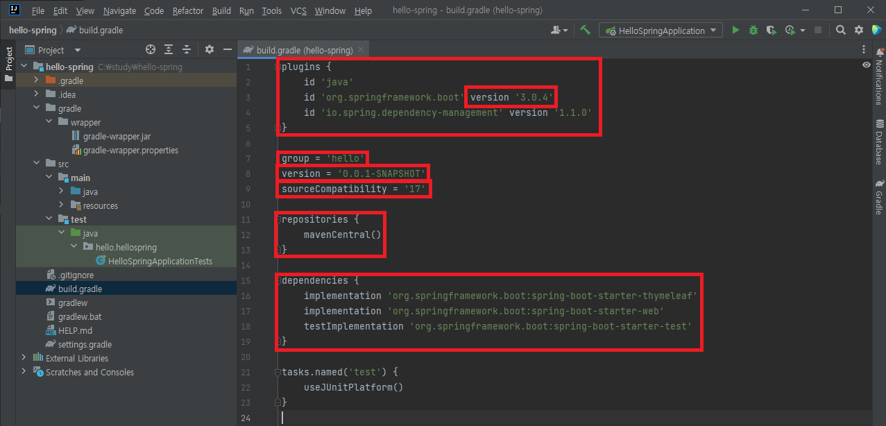 dependencies: 선택한 html 템플릿 엔진, web 프로젝트가 포함되고, 테스트 라이브러리인 JUnit5 버전이 기본적으로 들어감