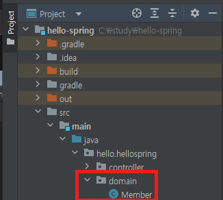 hello.hellospring.domain 패키지 생성, Member 클래스 파일 작성