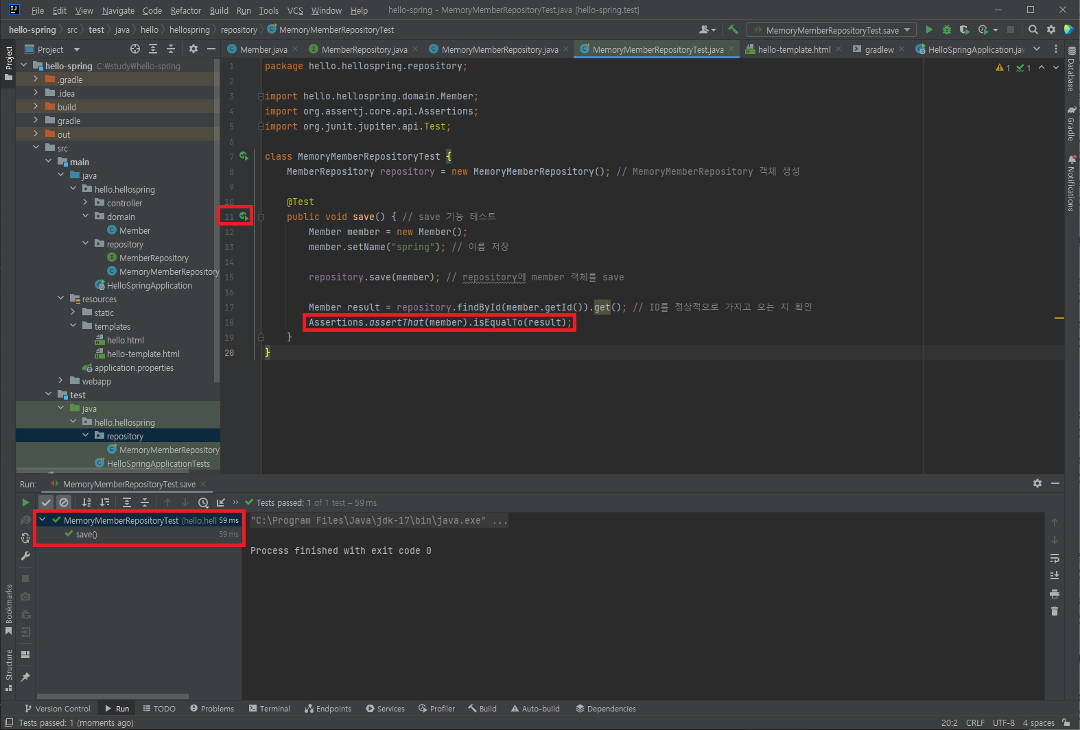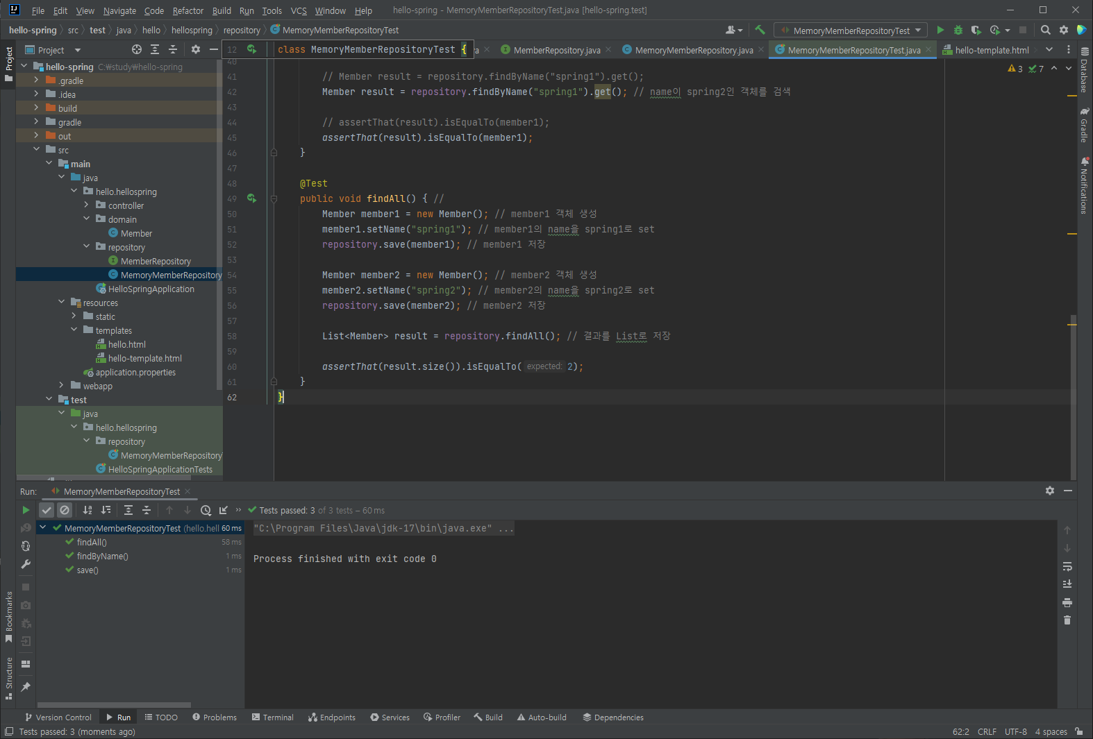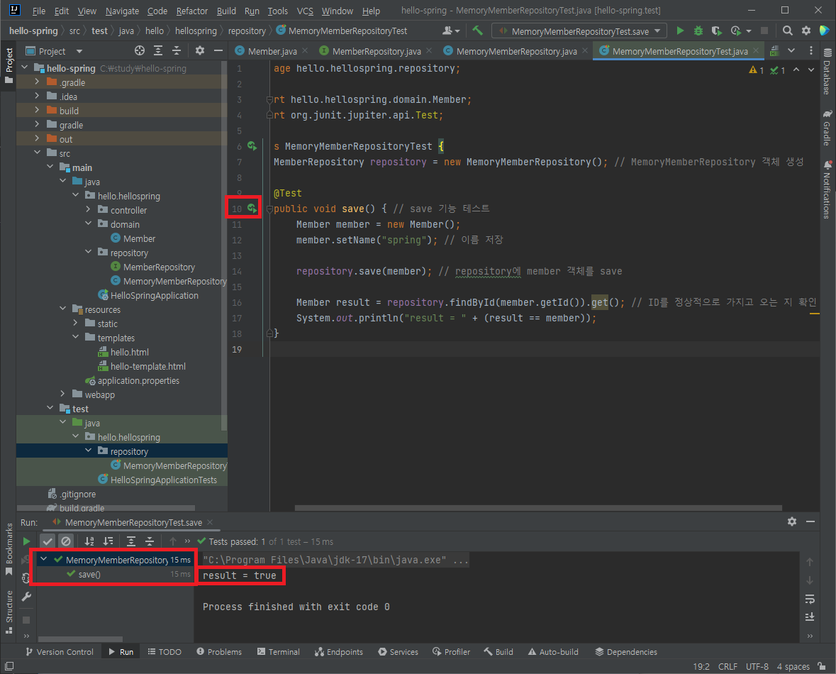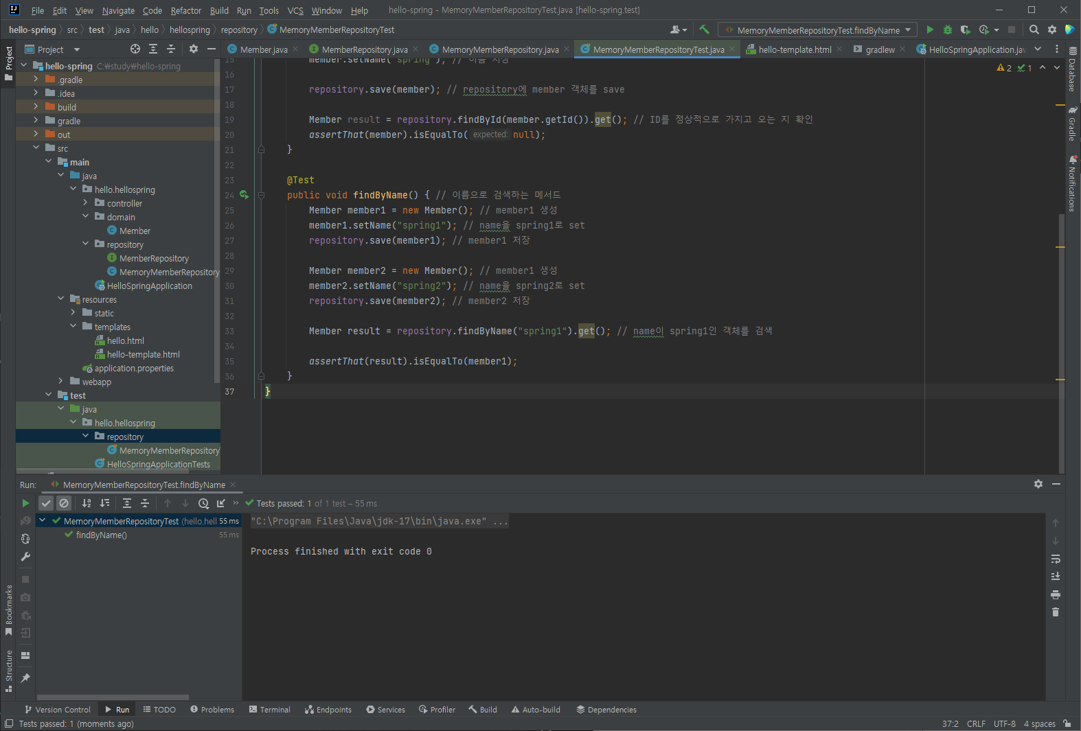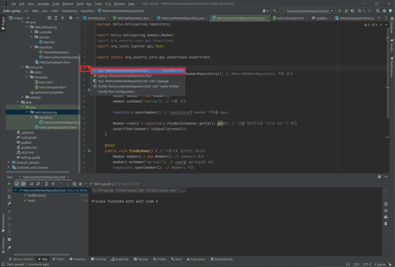 1. test/java/hello.hellospring.repository 패키지 생성, MemoryMemberRepositoryTest 클래스 파일 작성