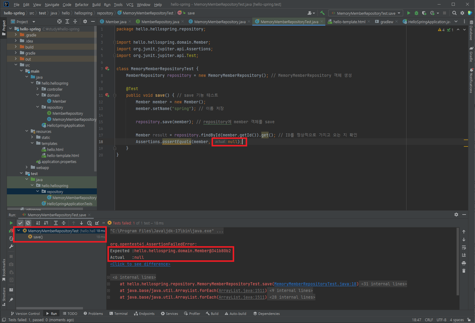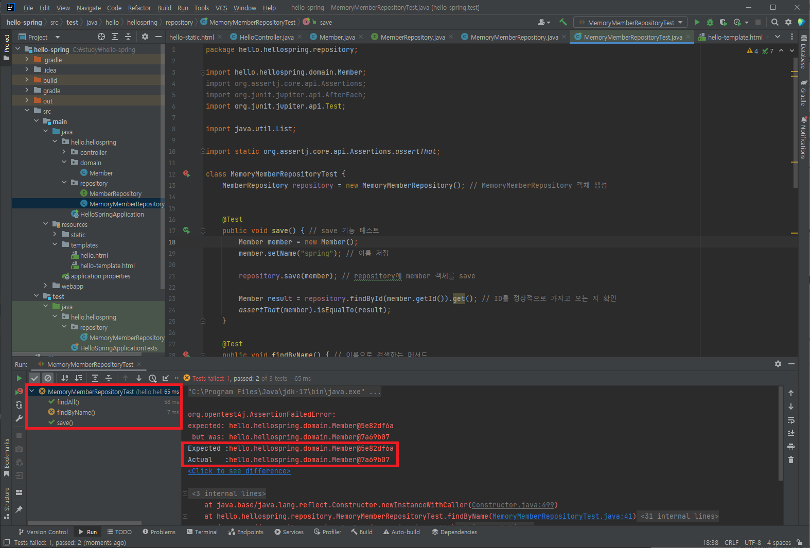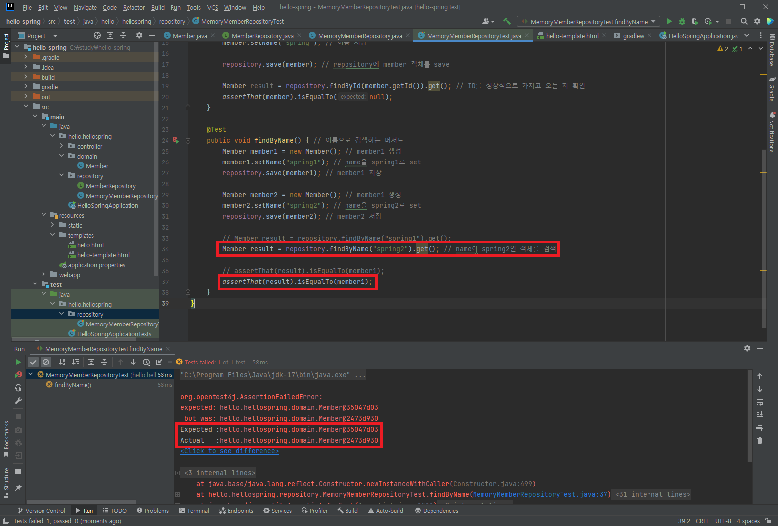 마지막 줄의 Assertions.assertEquals(member, result); 를 다음 코드로 대치한다.