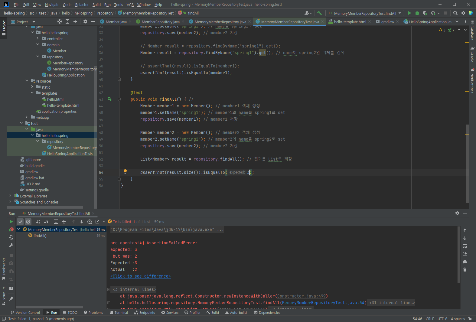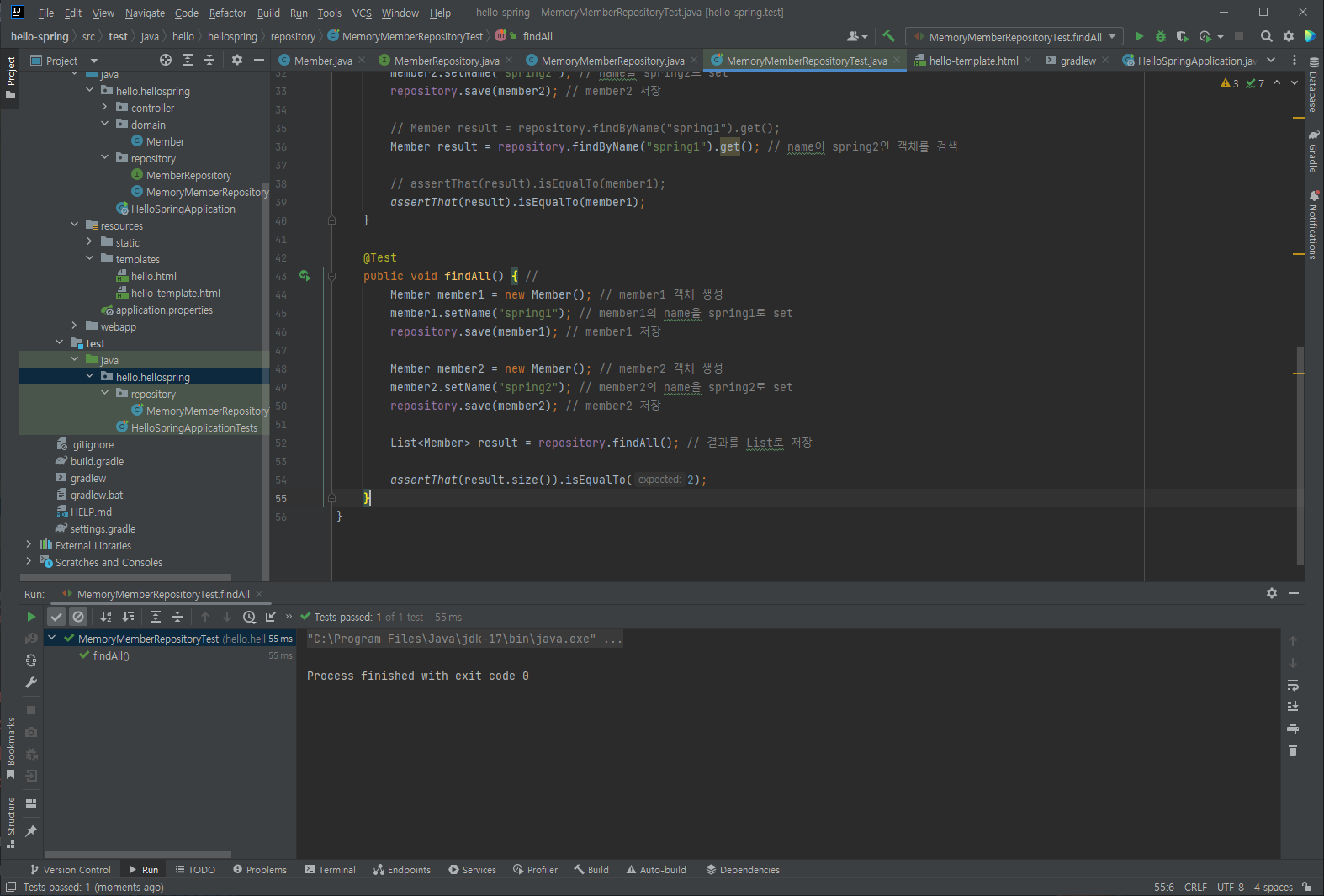 MemoryMemberRepositoryTest.java 클래스에 다음 코드를 추가