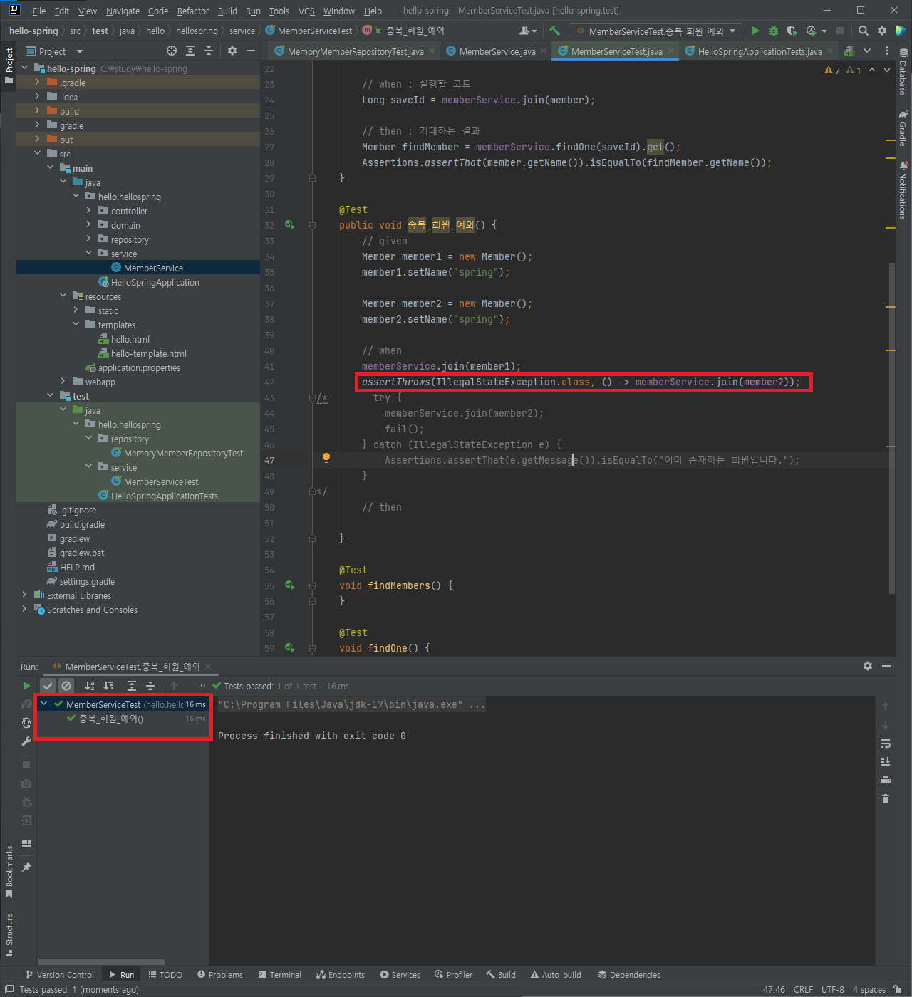 assertThrows(IllegalStateException.class, () -> memberService.join(member2)); // member2 회원이 가입하려고 할 때 IllegalStateException 예외가 발생하도록 테스트