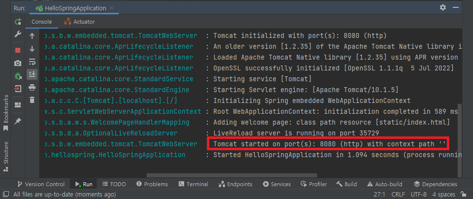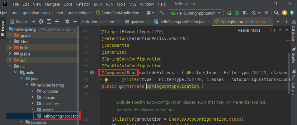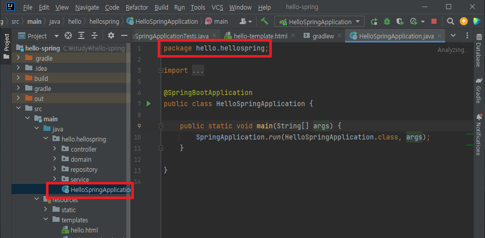 hello.hellospring 패키지의 HelloSpringApplication.java 파일의 내용을 보면 패키지의 이름이 적혀져 있는데,