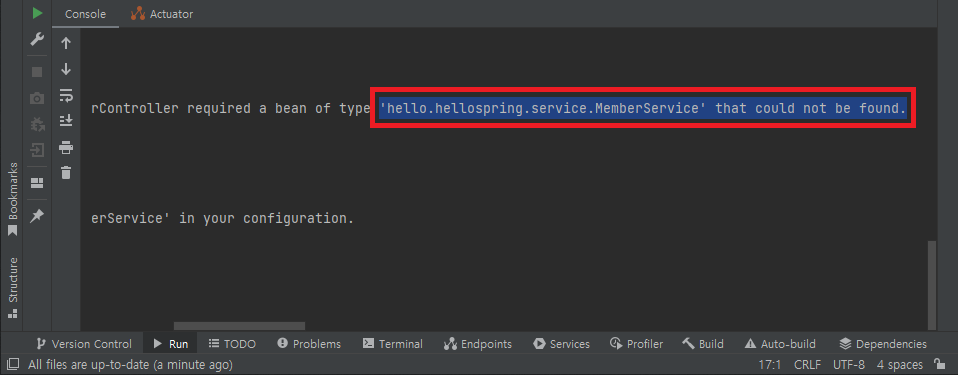 이 상태에서 프로젝트를 실행하면 MemberService를 찾을 수 없다는 오류가 발생한다.