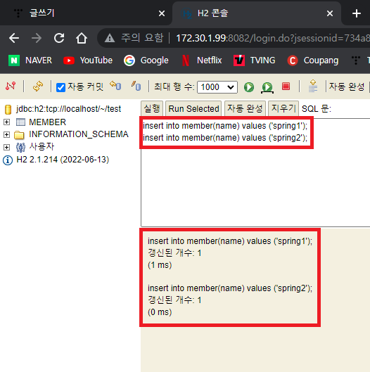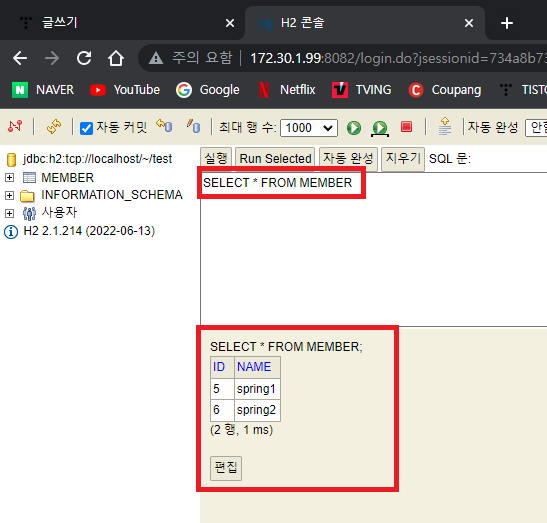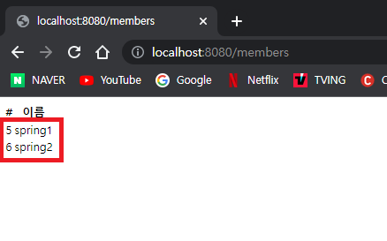 데이터 값을 임의로 추가해본다. spring1, spring2를 넣으면 다음처럼 ID 값은 자동으로 증가되는 것을 볼 수 있다.