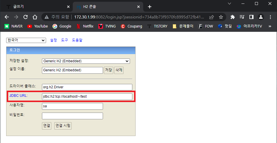 하지만 웹 애플리케이션과 웹 콘솔이 동시에 접근하게 되면 오류가 나서 충돌의 여지가 있기때문에 JDBC URL을 수정