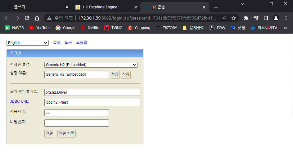 압축을 풀고 h2.bat 실행하면 로그인 화면이 나타남