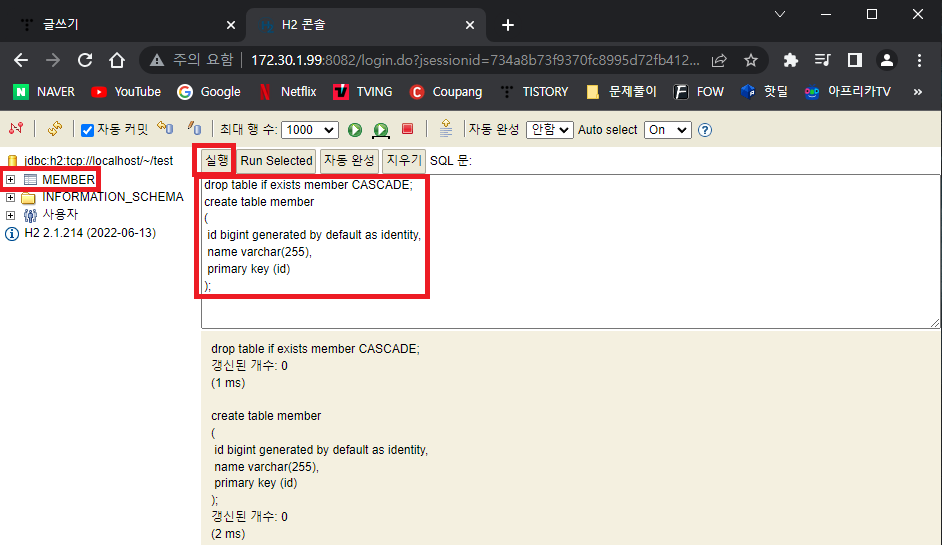 member 테이블이 생성되었고, 좌측에 생성하자마자 바로 테이블이 보인다. 조회를 해보자.