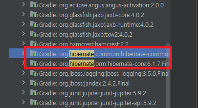 그리고 Reload All Gradle Projects를 한 후 External Library를 확인하면 hibernate가 추가된 것을 확인할 수 있다.