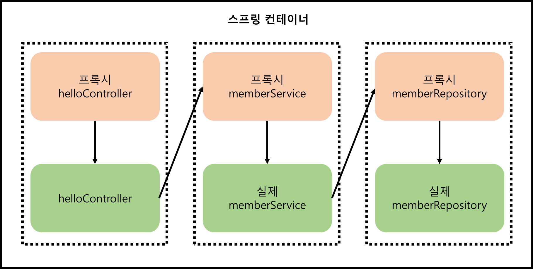 단지 helloController가 memberService를 호출하는 관계였다가, AOP를 적용하면 아래와 같이 된다.