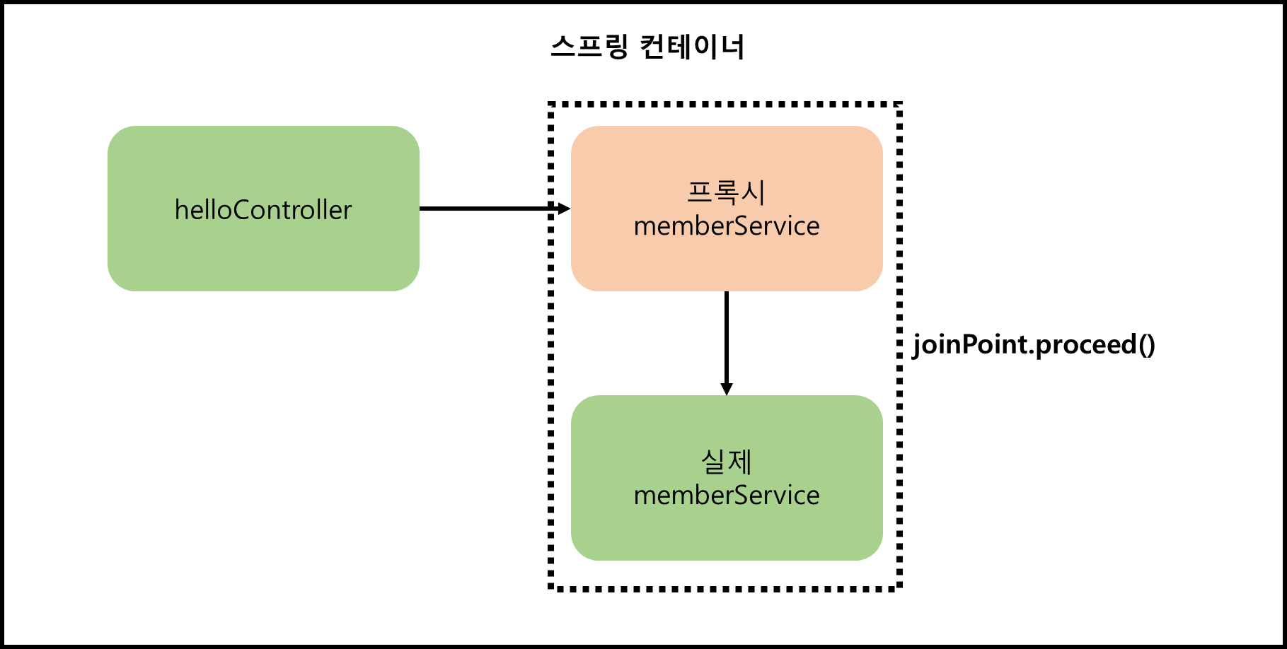 스프링 컨테이너의 동작방식: 스프링 빈을 등록 시 가짜 스프링빈을 등록하고 가짜 스프링빈이 끝나면 joinPoint.proceed()를 실행하면 그때서야 실제 memberService를 호출해준다.