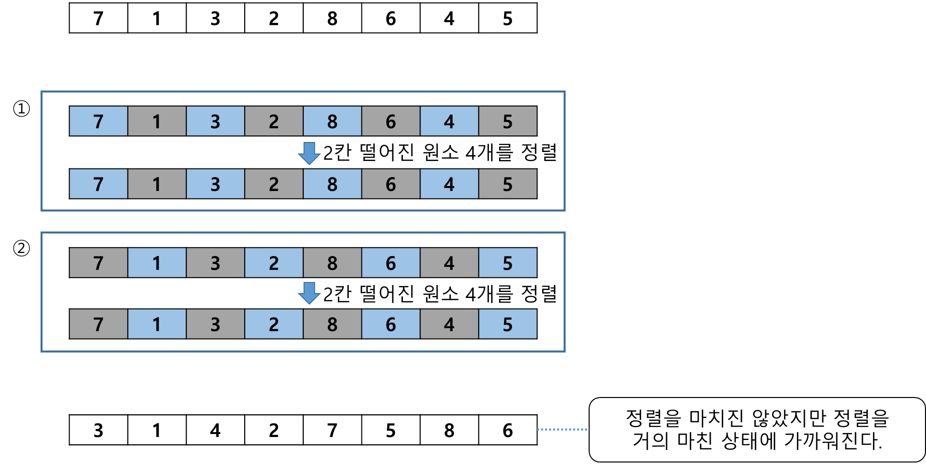 이렇게 해서 얻은 배열은 좀 더 정렬된 상태에 가까워진다. 마지막으로 '1-정렬'을 적용하여 1칸 떨어진 배열, 즉 배열 전체에 적용하면 정렬이 완료된다.