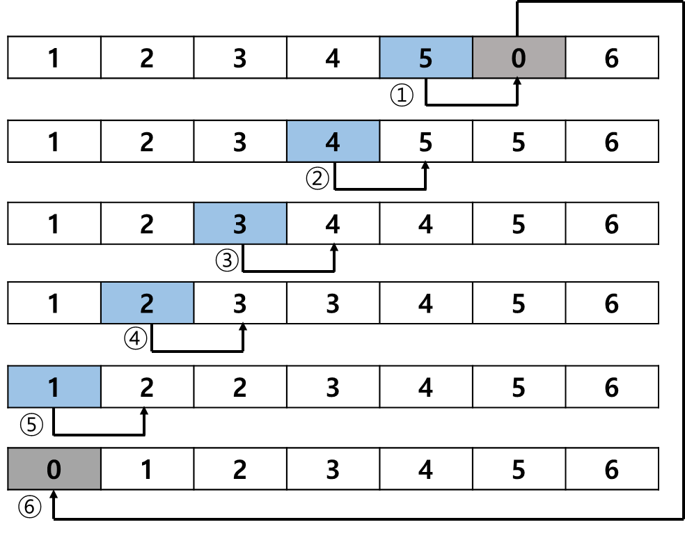 여기까지는 이미 정렬을 마친 상태이므로 원소의 이동(값의 대입)은 발생하지 않는다. 이 단계까지는 아주 빠르게 완료한다. 그러나 아래 그림과 같이 여섯 번째 원소인 0을 삽입 정렬하려면 총 6번에 걸쳐 원소를 이동(대입)해야 한다.