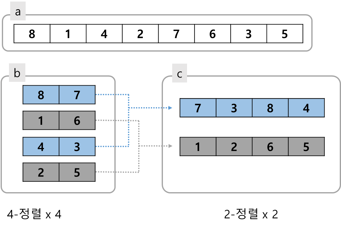 a 배열을 바로 단순 삽입 정렬하지 않고 '4-정렬'과 '2-정렬'을 먼저 수행하여 정렬을 거의 마친 상태인 c를 만든다.
