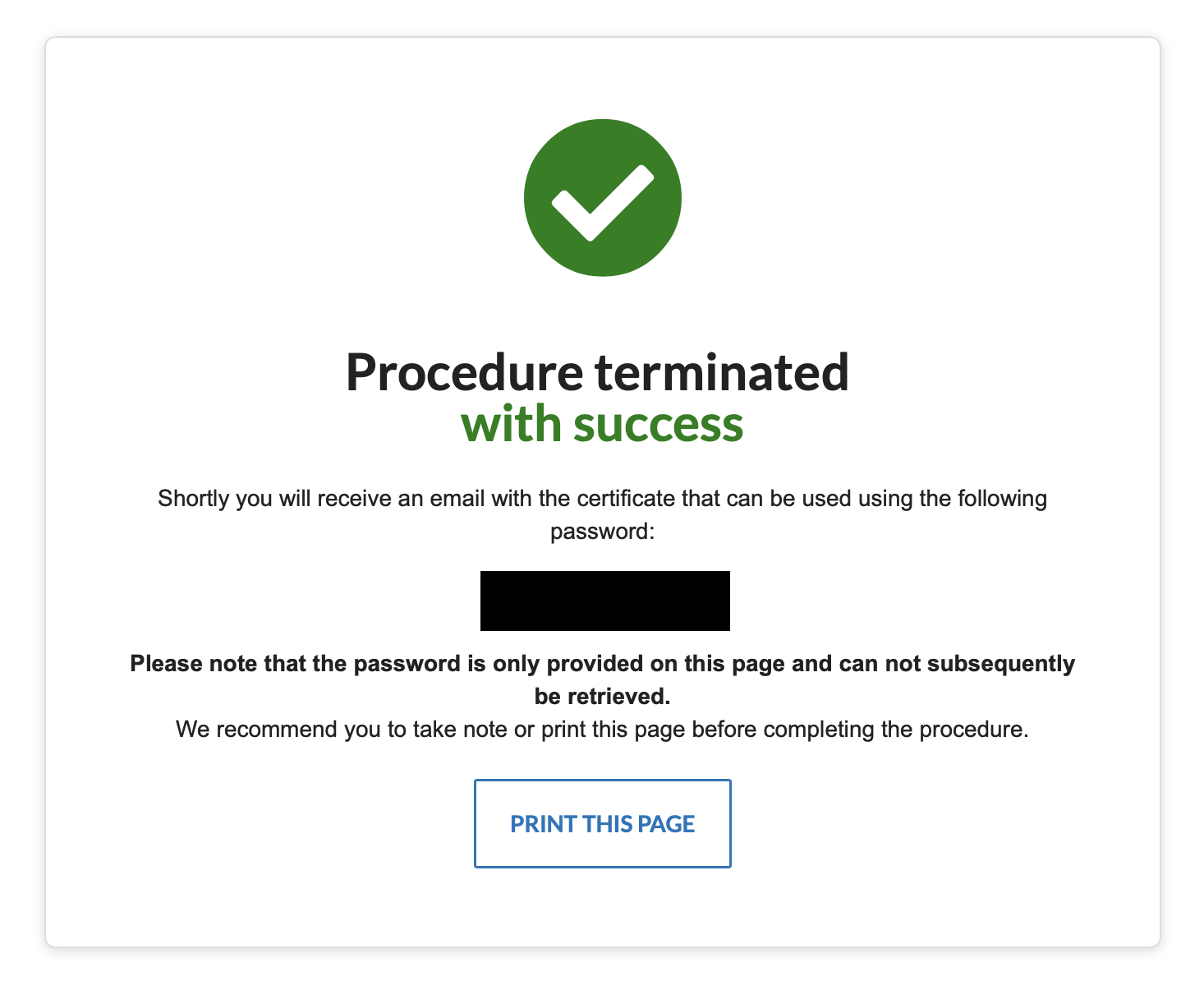 6. 마지막으로 Actalis 사이트로 다시 돌아와보면 성공적으로 완료되게 되었다는 메시지와 함께 패스워드가 같이 보이게 된다.