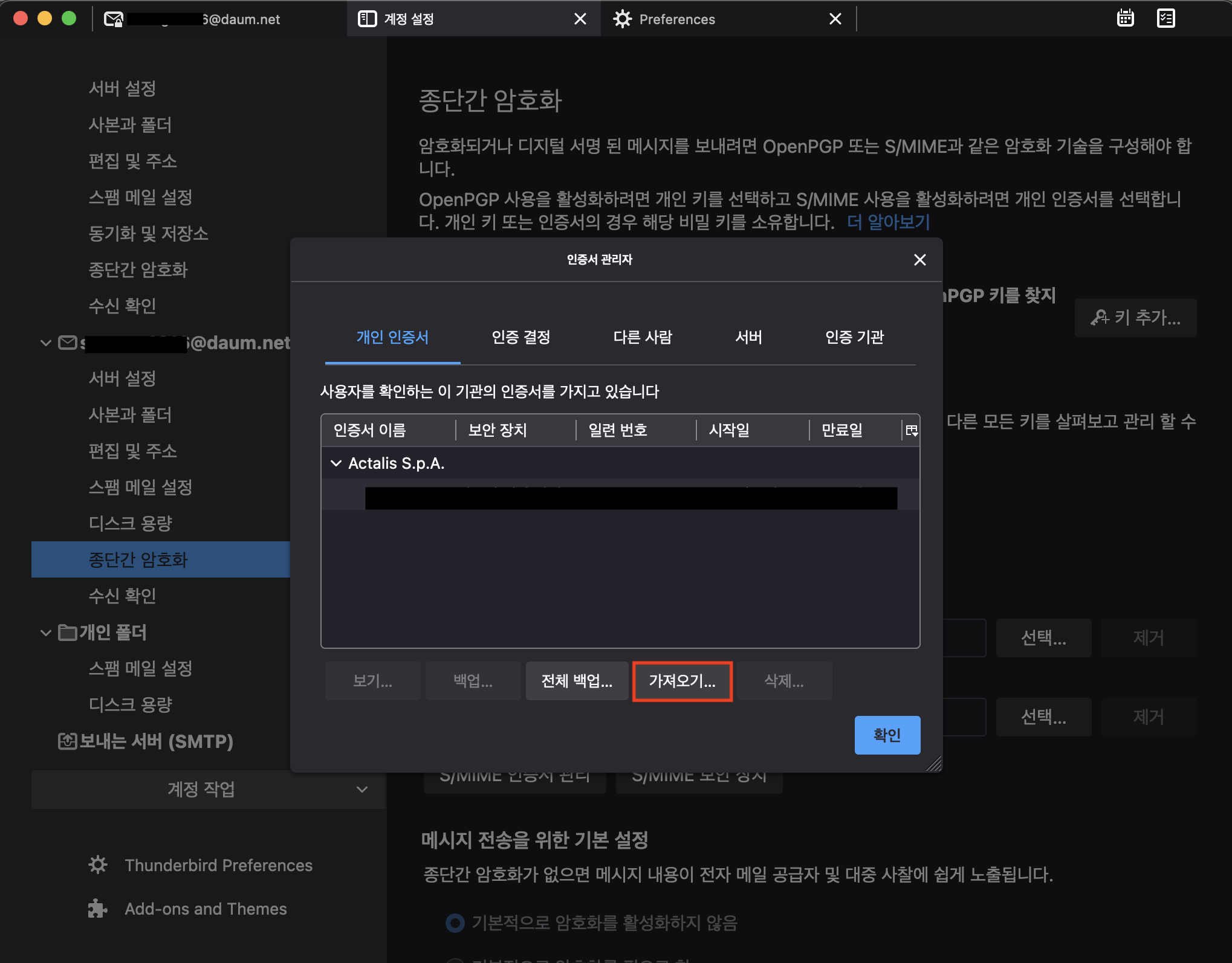 아래 과정을 따라하면 ThunderBird에 인증서를 등록하여 메시지 암호화와 전자 메일 인증서 서명이 가능하게 된다.