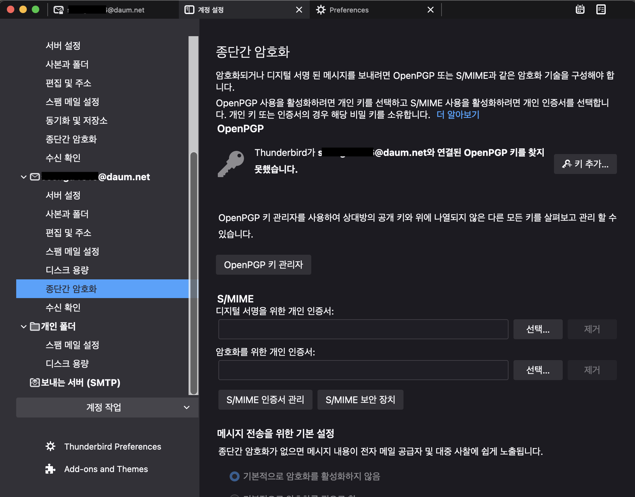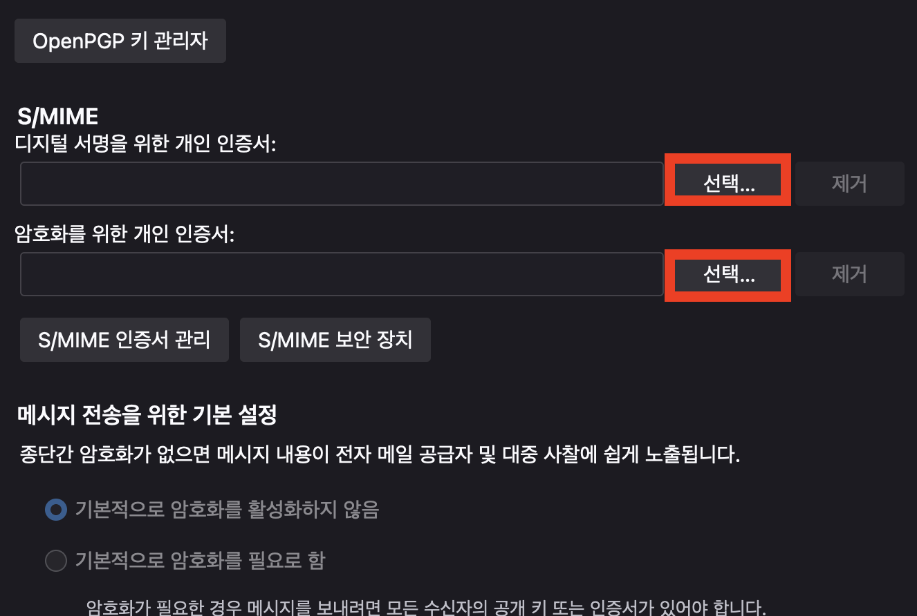 8. 해당 계정 설정 페이지에서 '종단간 암호화' 탭에 들어가면 'S/MIME' 라는 메뉴가 있고 아래에 '디지털 서명을 위한 개인 인증서'를 가져오기 위해 'S/MIME 인증서 관리' 를 눌러준다.