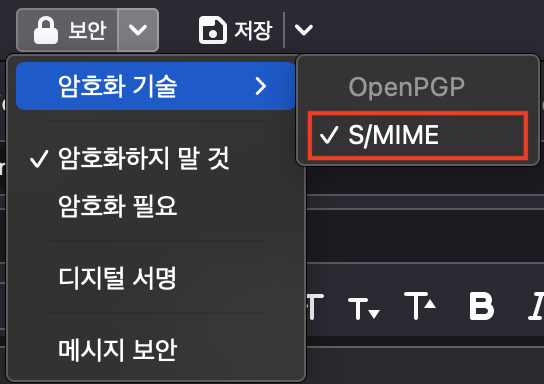 18. '암호화 기술'에서는 우리가 추가한 'S/MIME' 인증 방법을 선택해준다.