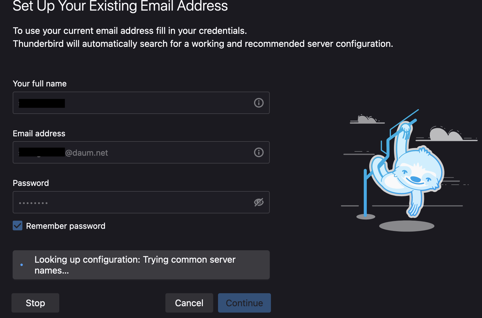 4. 이런 경우는 해당 메일 계정의 환경설정에서 IMAP/POP 기능 설정을 사용으로 체크했는지 다시 한 번 확인해주고, 사용함으로 되어있다면 아래 사진처럼 입력해준다.(예시 사진은 다음 메일에 한해서 설정한 것이다. 네이버 또는 기타 계정을 해당 계정의 설정 방법을 참고하기 바란다.)