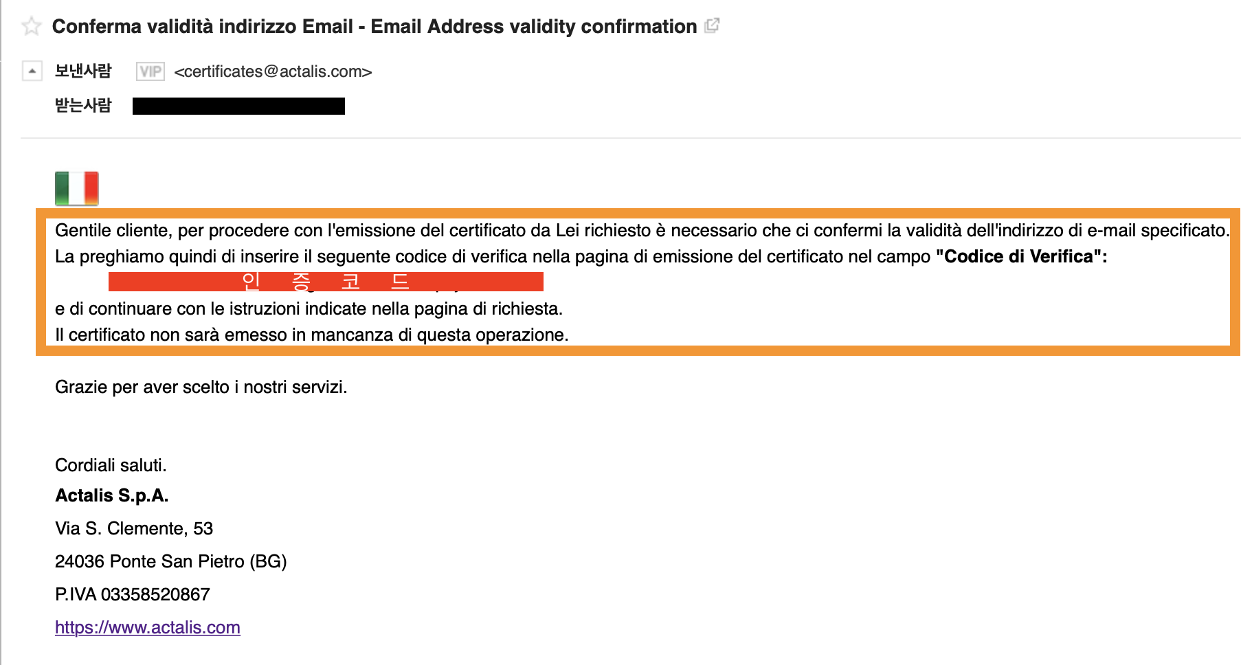 아래 이미지부터는 Actalis 사이트에서 이메일을 인증하고 인증서를 발급하는 과정이다.