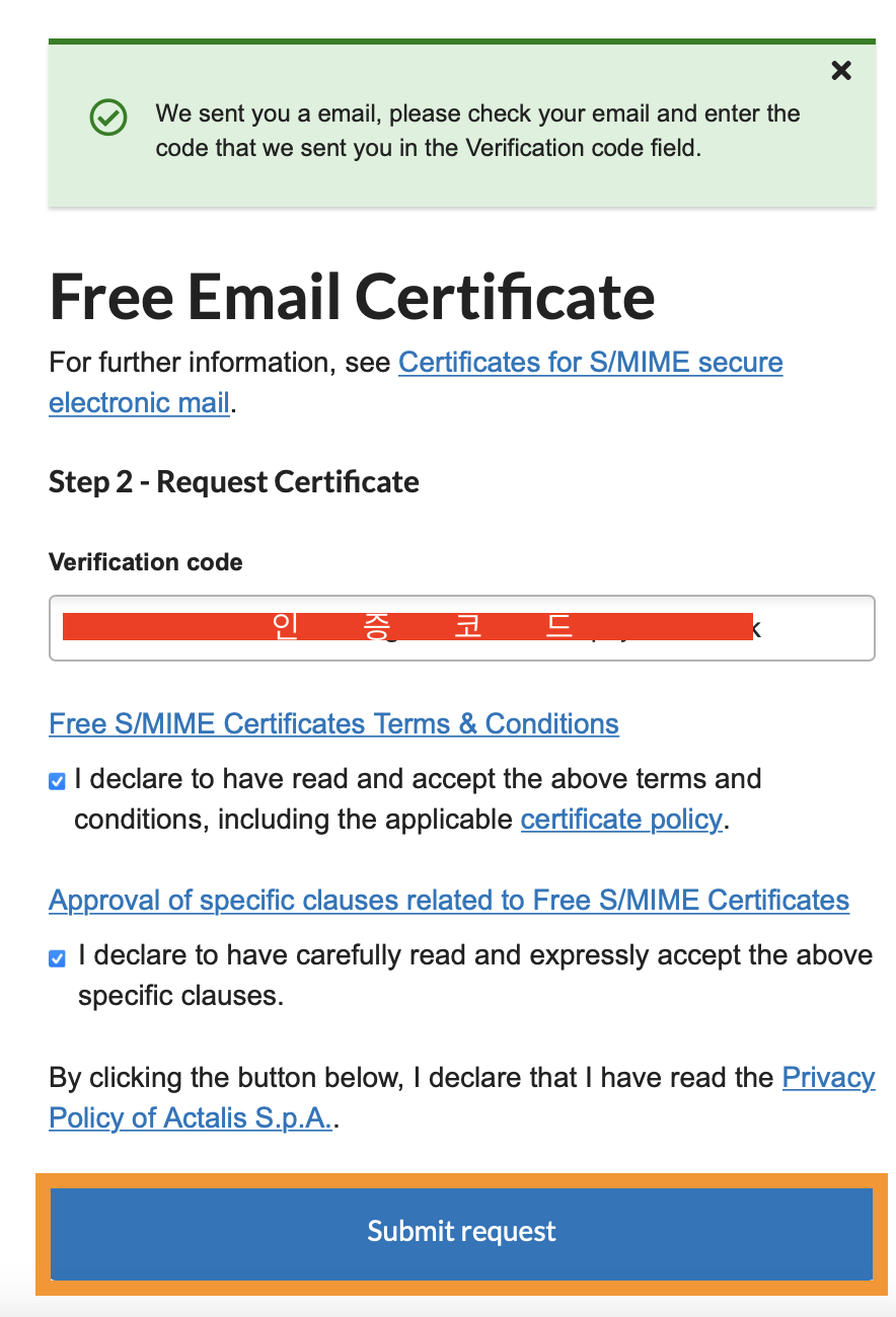 4. 다시 Actalis 사이트로 와보면 인증 코드를 적는 란이 있는데 방금 복사한 코드를 넣어주고 아래 체크박스 두개를 체크한 후 'Submit request' 버튼을 클릭해준다.