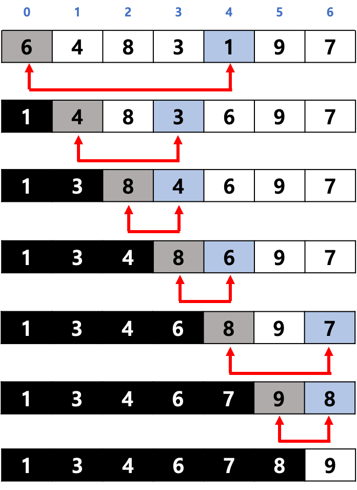선택 정렬은 위와 같은 과정으로 수행된다.
