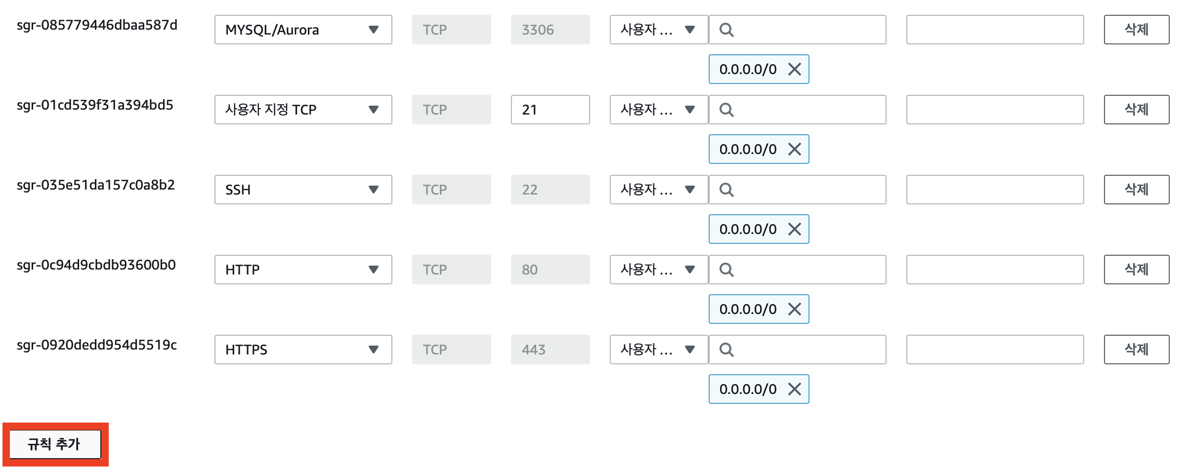 4. 인바운드 규칙 편집에서는 방화벽을 거쳐 해당 인스턴스에 접속하는 모든 포트 번호에 대한 설정을 해줄 수 있다.