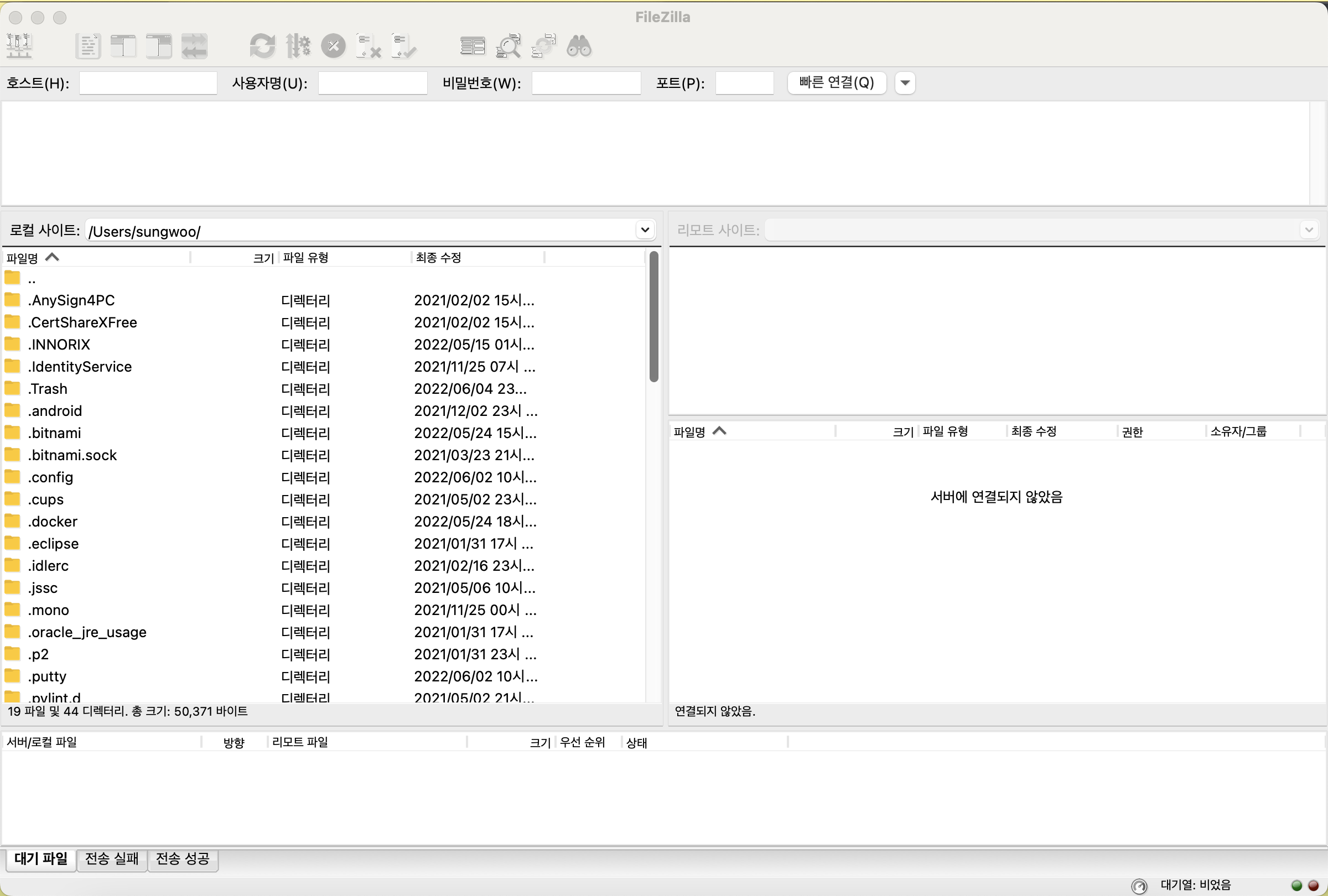 6. FileZilla에 들어온 화면이다. 다른 FTP도 메뉴 구성만 다를 뿐 기본적인 구조는 비슷할 것이다.